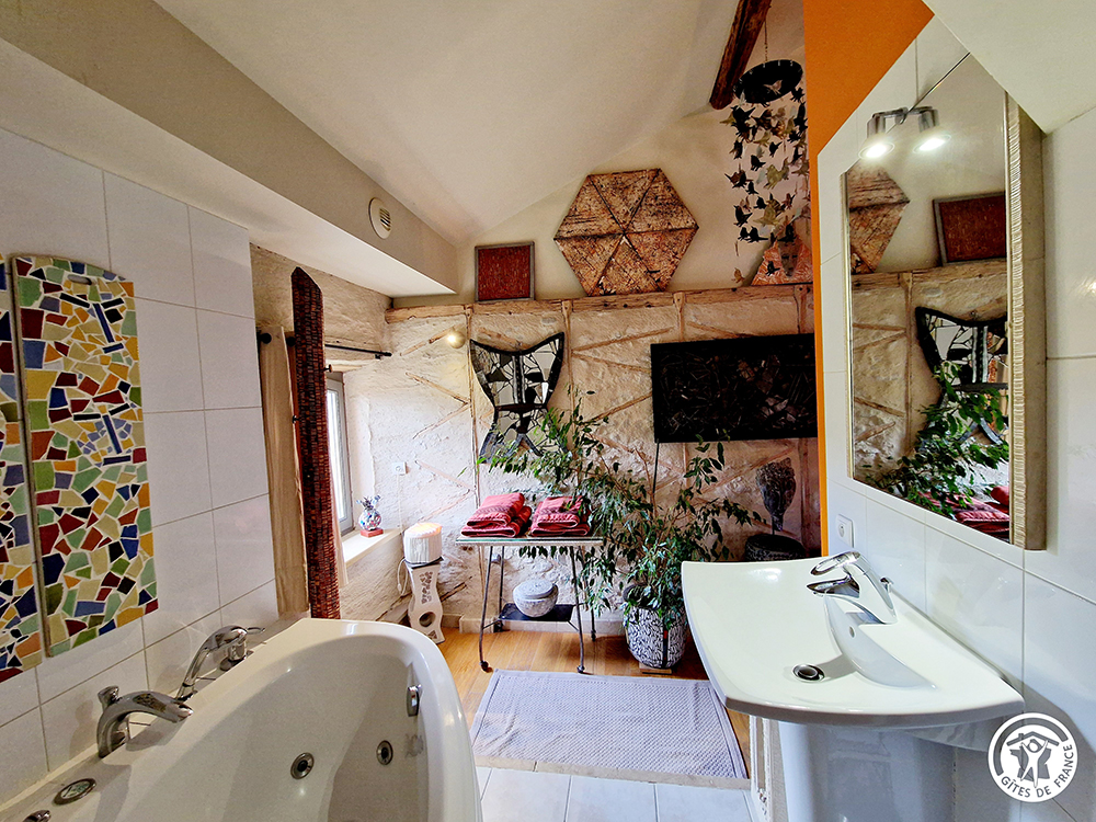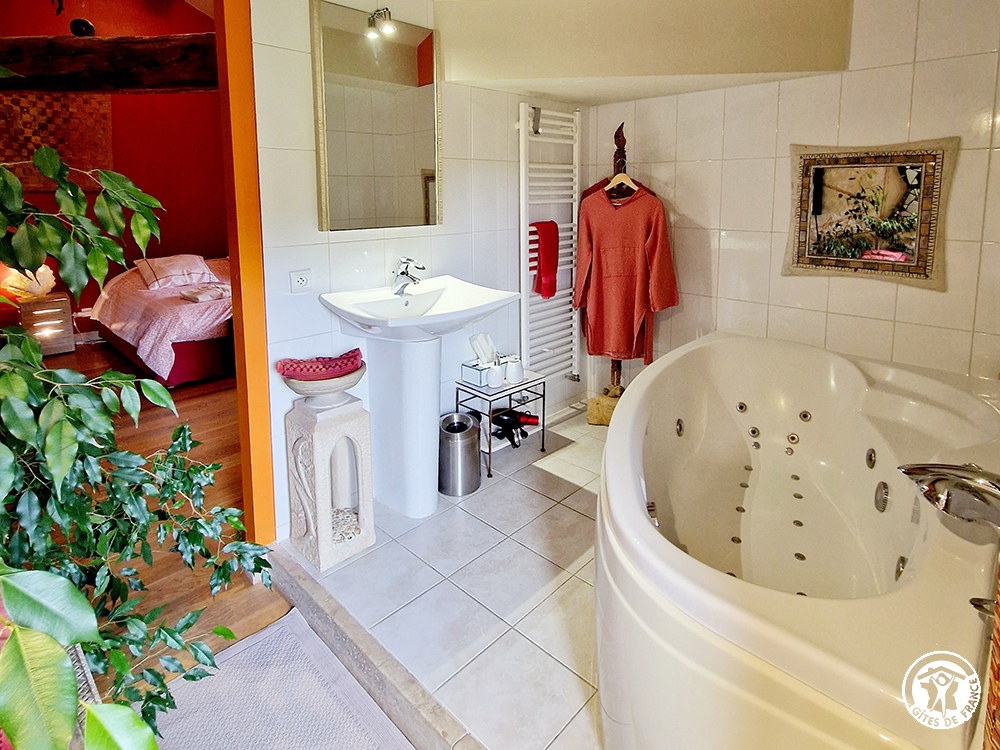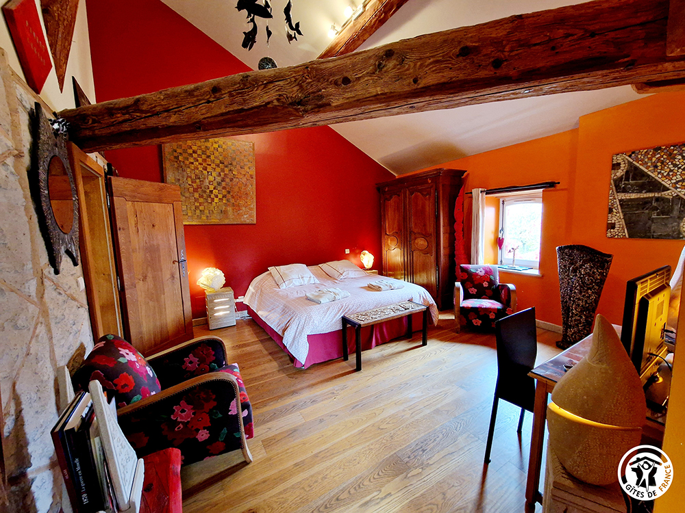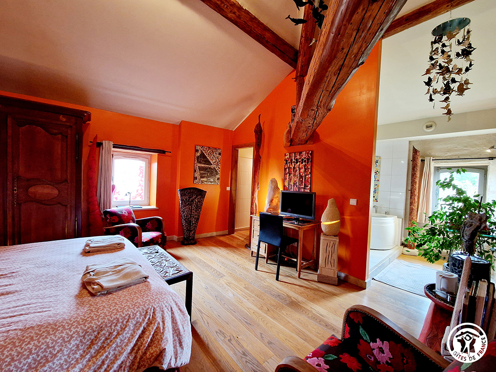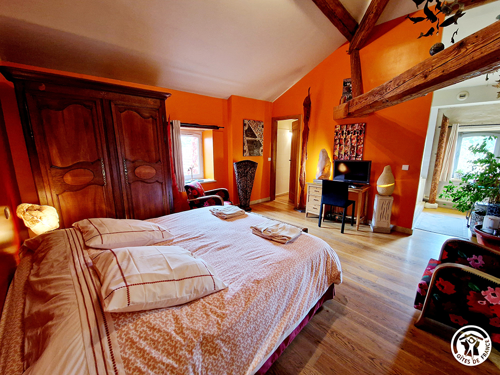 Située à l'étage, cette chambre est équipée d'un lit de 1,80 x 2m avec Salle de bain balnéo et WC séparé.
